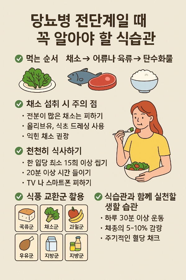 #당뇨병전단계 #혈당관리 #당뇨식단 #식품교환군 #천천히먹기 #식사순서 #채소섭취법 #공복혈당 #당화혈색소관리 #당뇨예방식습관
