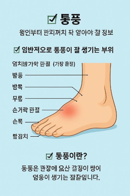 이 중 엄지발가락 관절은 통풍의 대표적인 초기 증상 부위입니다. 붉게 부어오르고 열감이 심하게 느껴지며, 살짝만 스쳐도 큰 통증이 나타납니다.